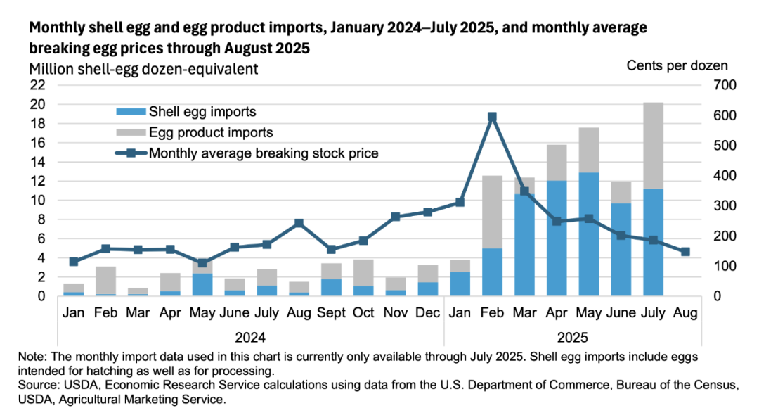 另一方面,带壳鸡蛋的进口主要来自巴西(进口量为500万打)和墨西哥(进口量为280万打)。由于进口鸡蛋几乎全部销往美国破壳鸡蛋市场,因此推动破壳鸡蛋进口的是破壳鸡蛋价格,而非带壳鸡蛋价格。