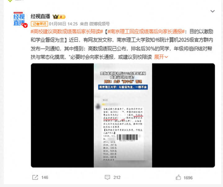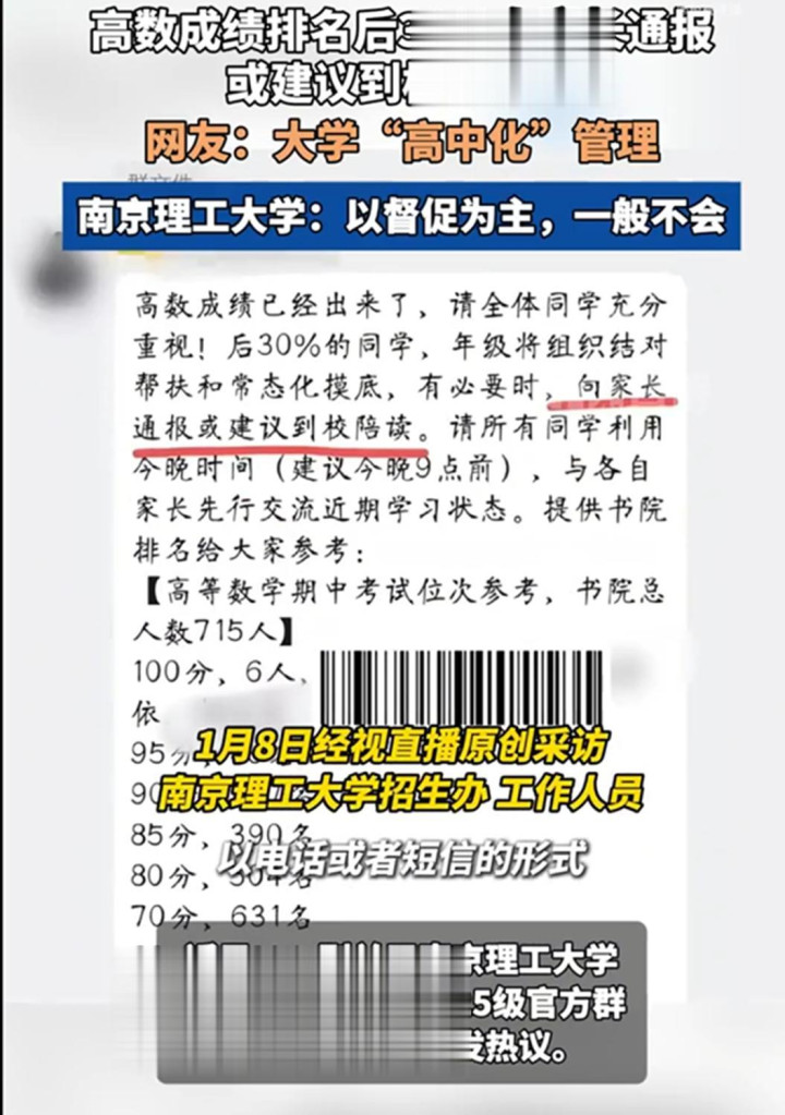 该校高数挂科率居高不下,学院针对成绩垫底的学生出台帮扶建议,明确提出让家长到校陪读,监督学生刷题、打卡学习进度,还要求每天拍陪读视频发给辅导员。